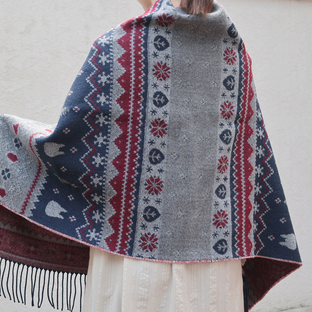 "Eine warme Stola mit fein gewebtem Jacquard-Design. Sie hat Knöpfe, sodass Sie sie wie einen Poncho anziehen können.