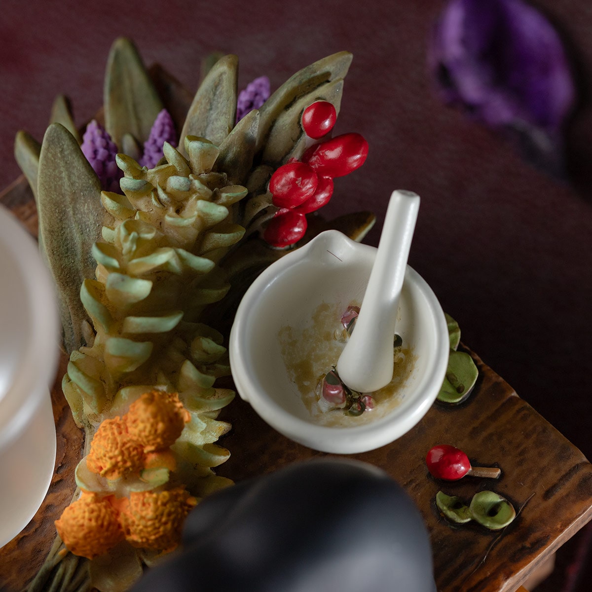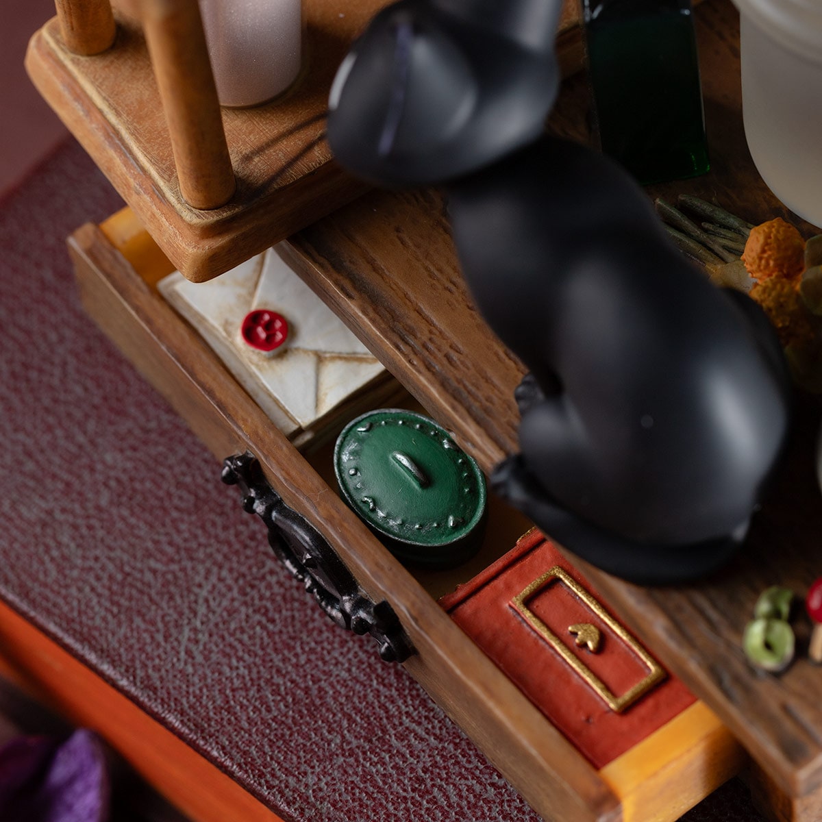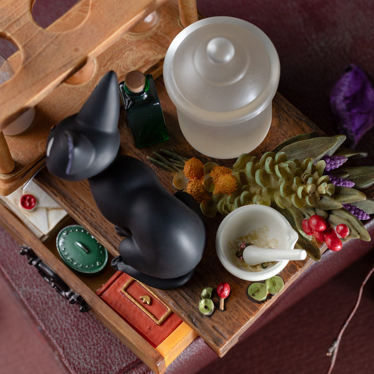 There are kokiri experimental tools and dried flowers on the desk, and Jiji, who is staring at the sand where the hourglass falls, is very cute!