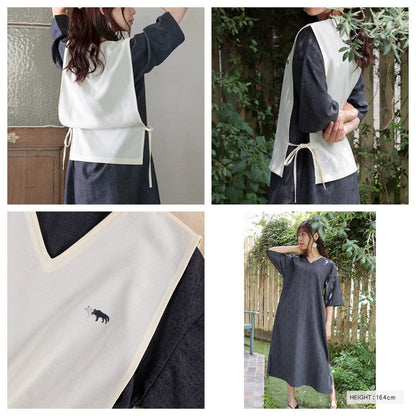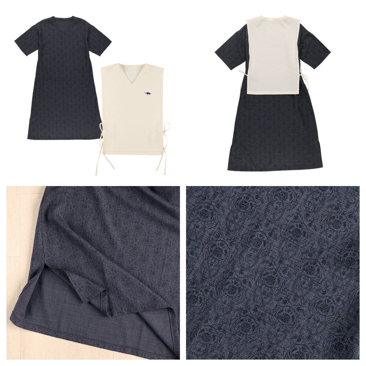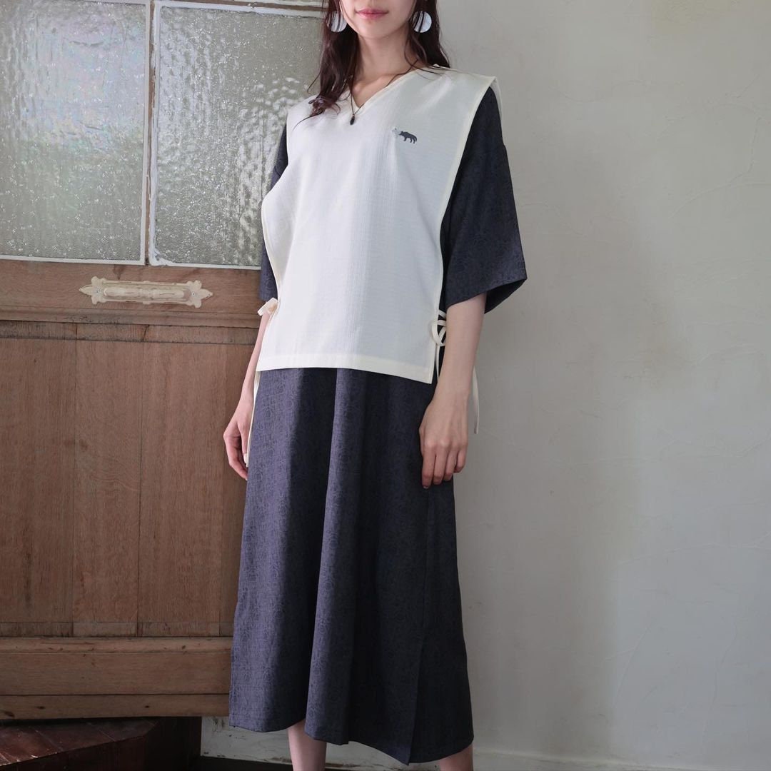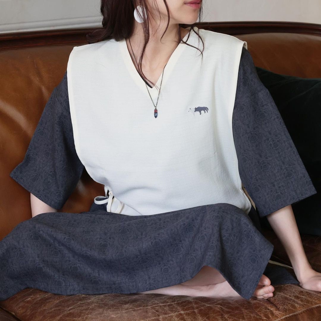 The fabric is linen-like, giving it a natural feel. The vest has a V-neck and the dress has cuts to express San's dignity.