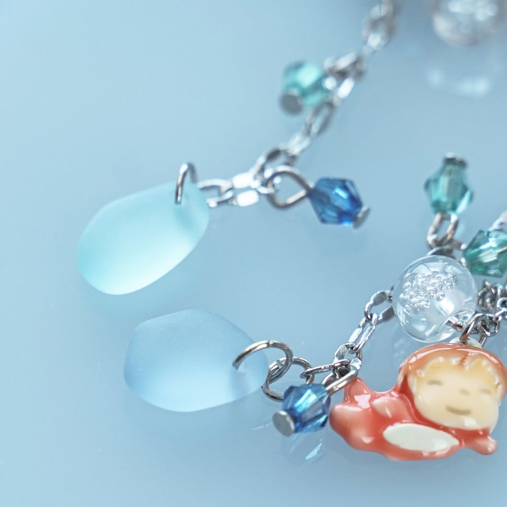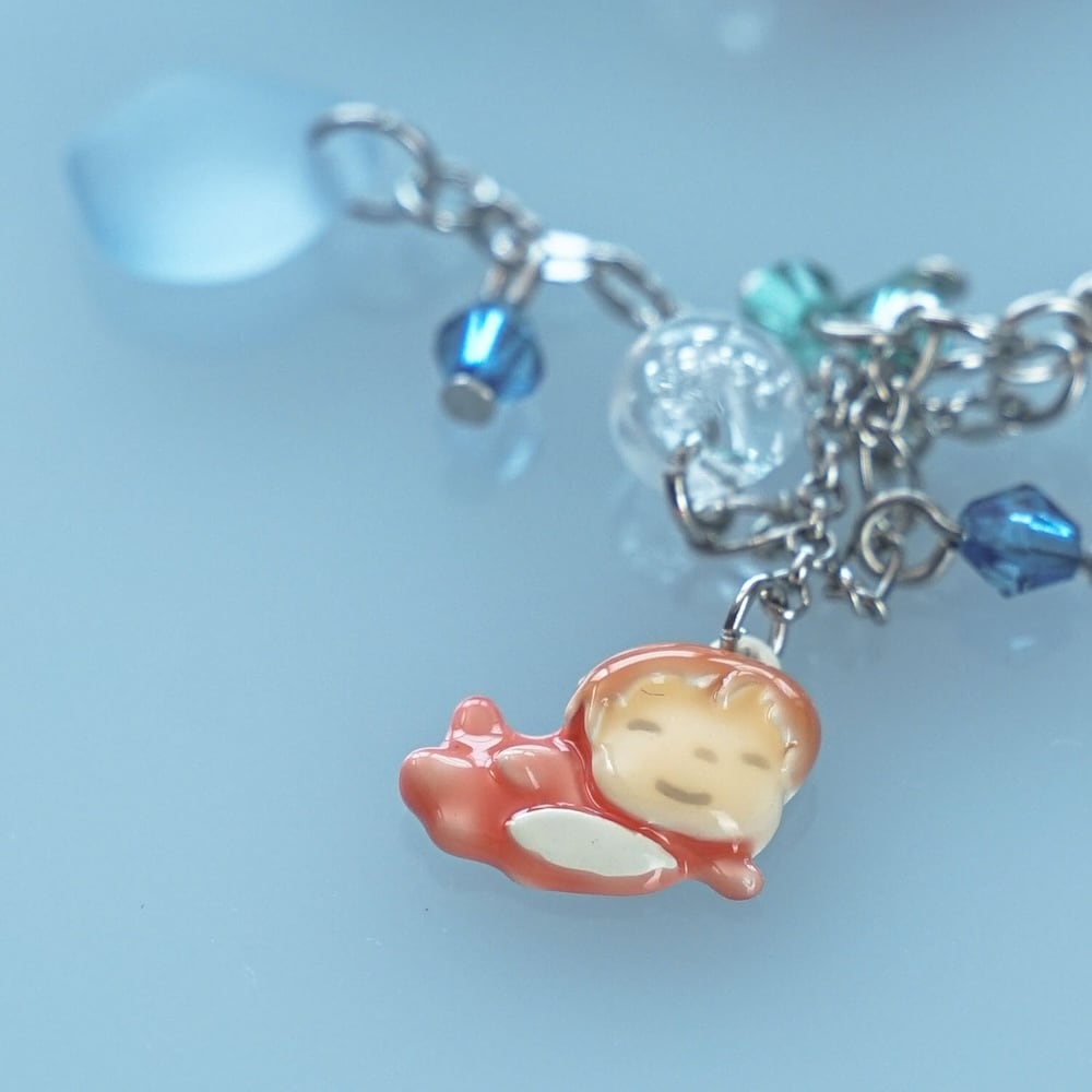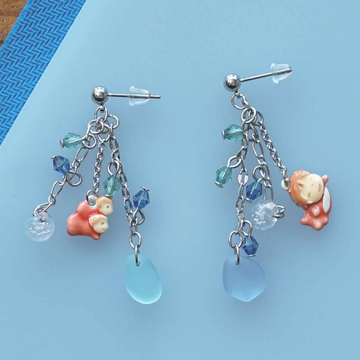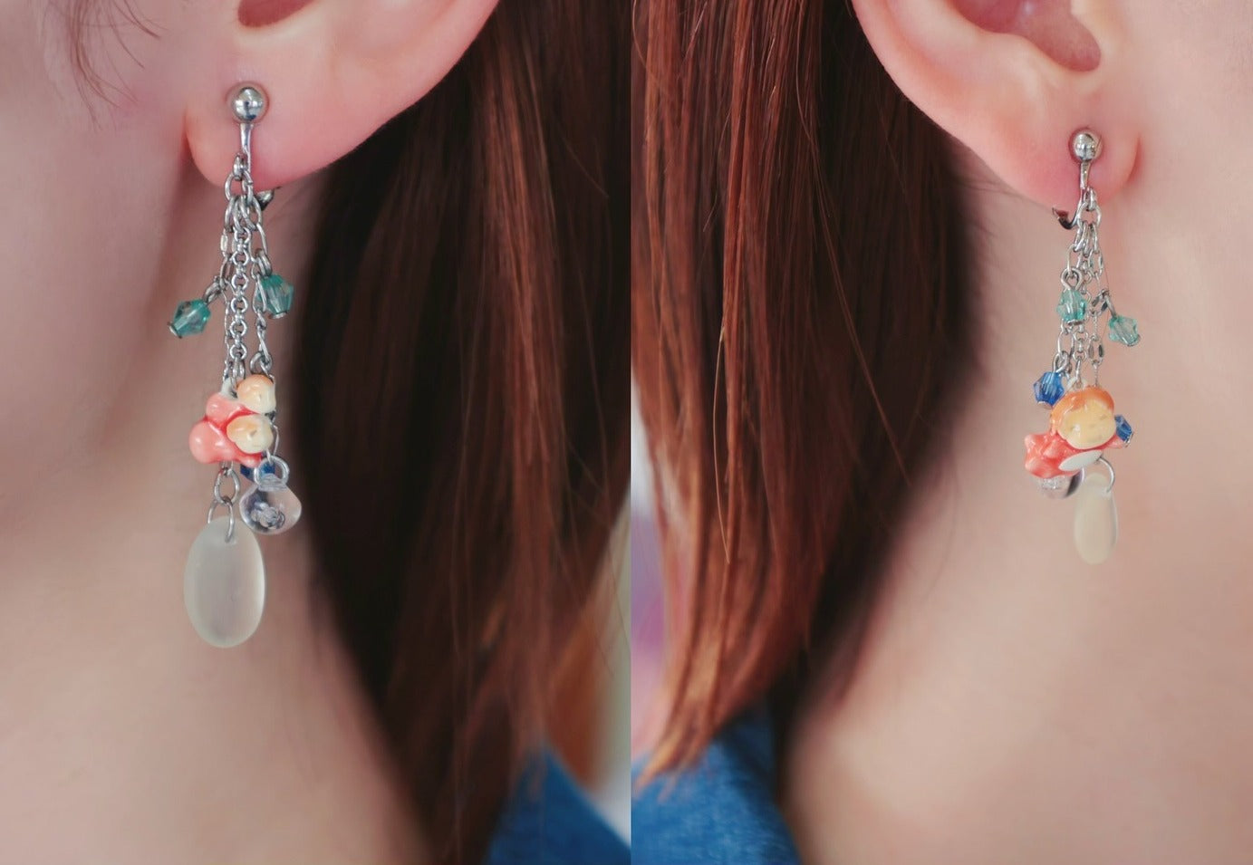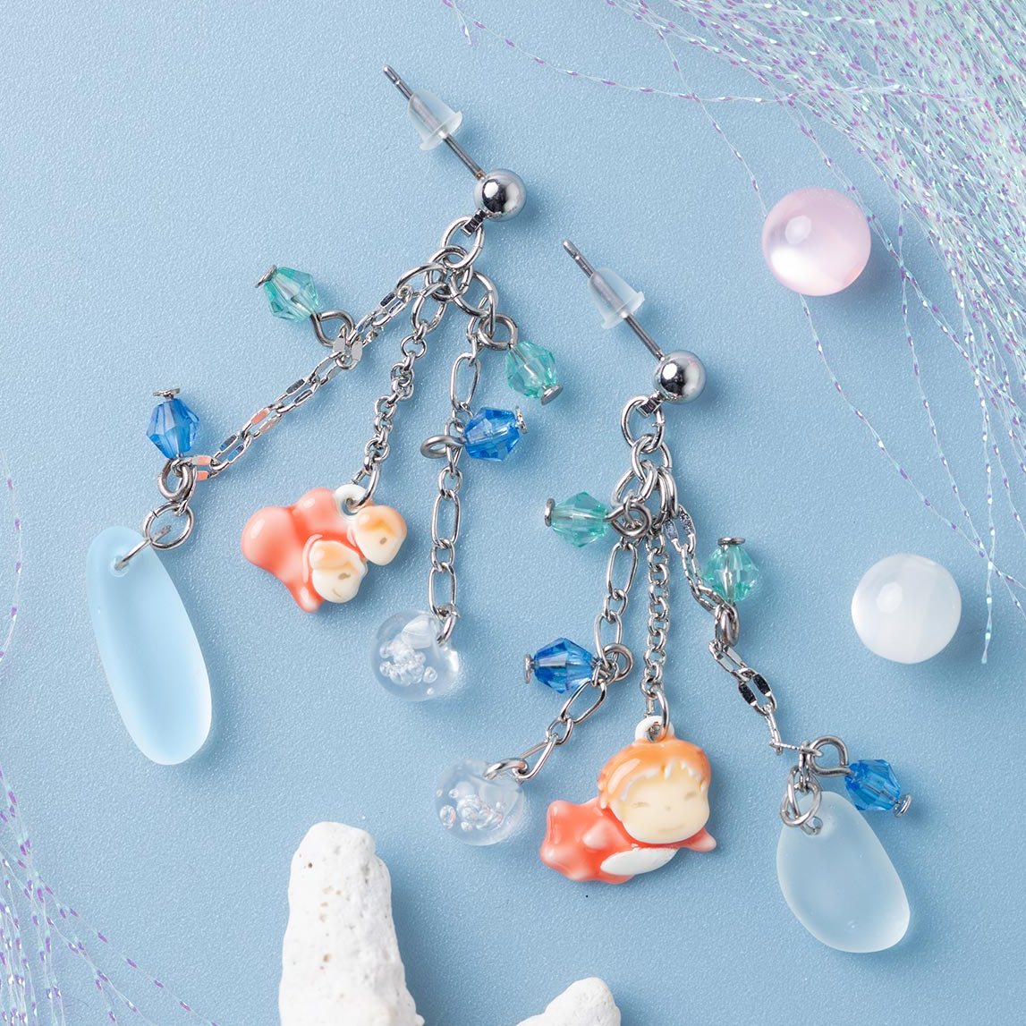 "The soft texture of the cute ceramic-like parts of Ponyo and her little sisters is expressed through the beads and sea glass-like parts in ocean colors that sway next to your ears.