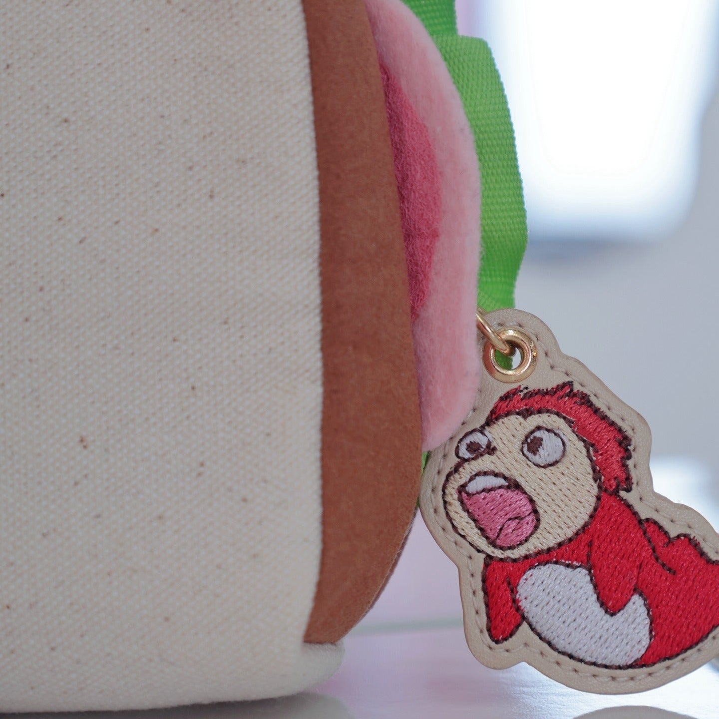 The zipper has an embroidered charm of a cute Ponyo stuffing her mouth with ham.