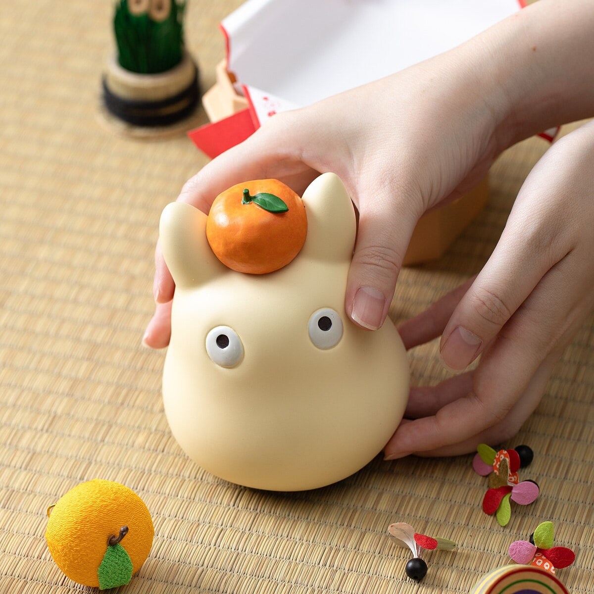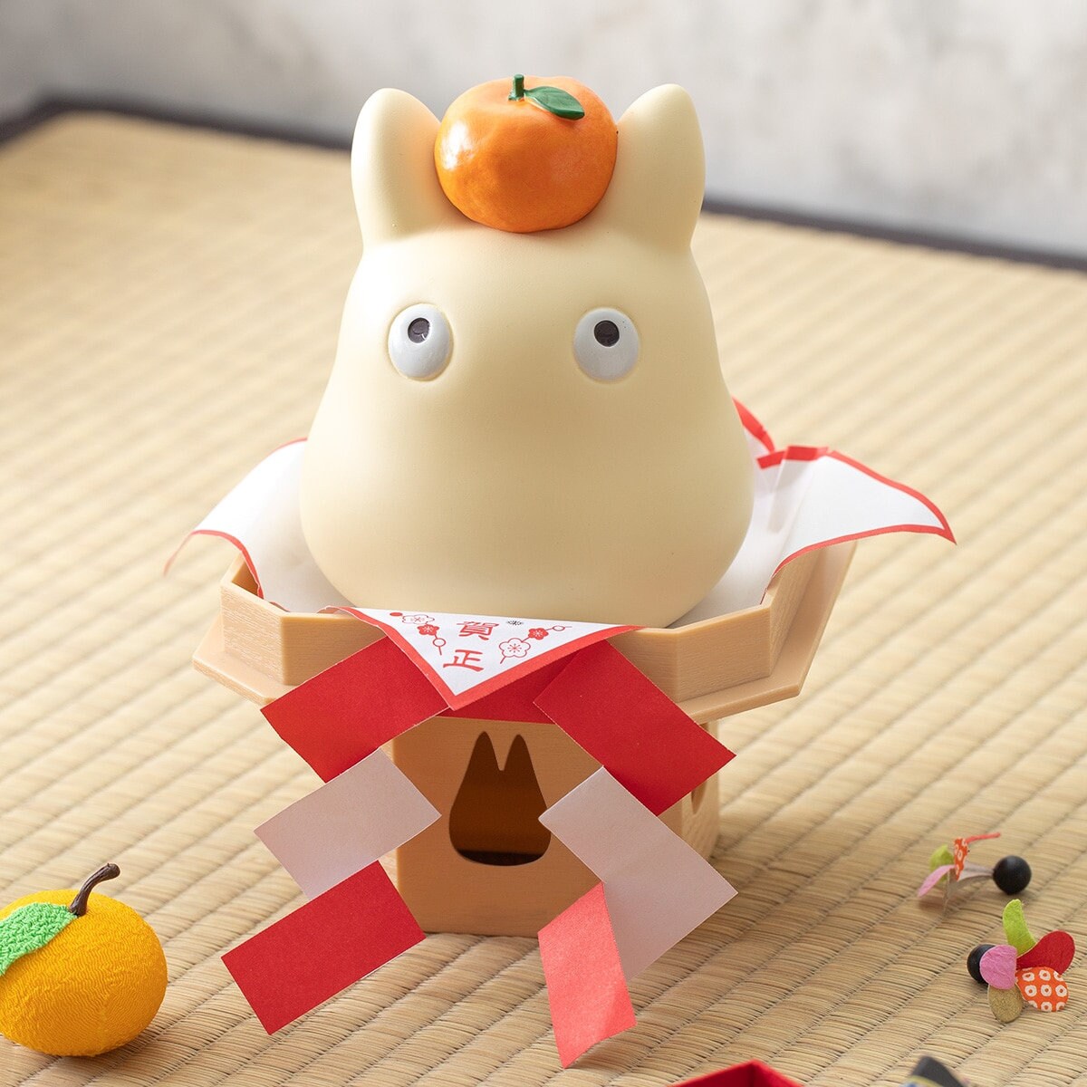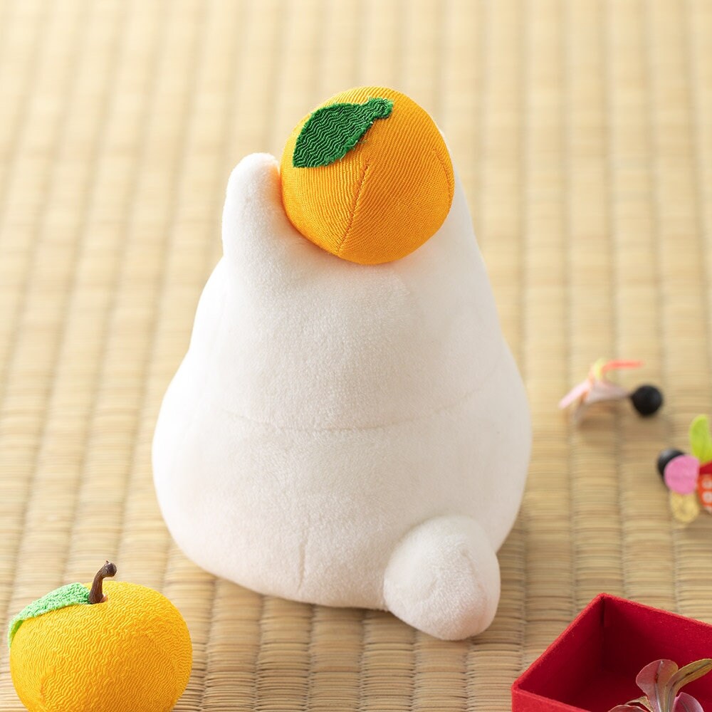 "This is a small Totoro with a mandarin orange on his head and a chewy and soft shape like a kagami mochi.