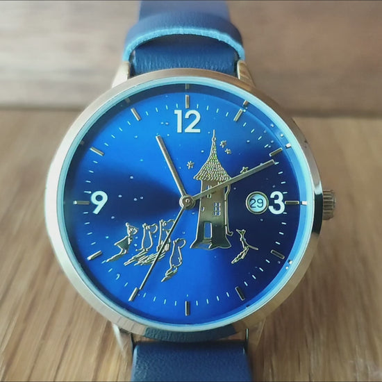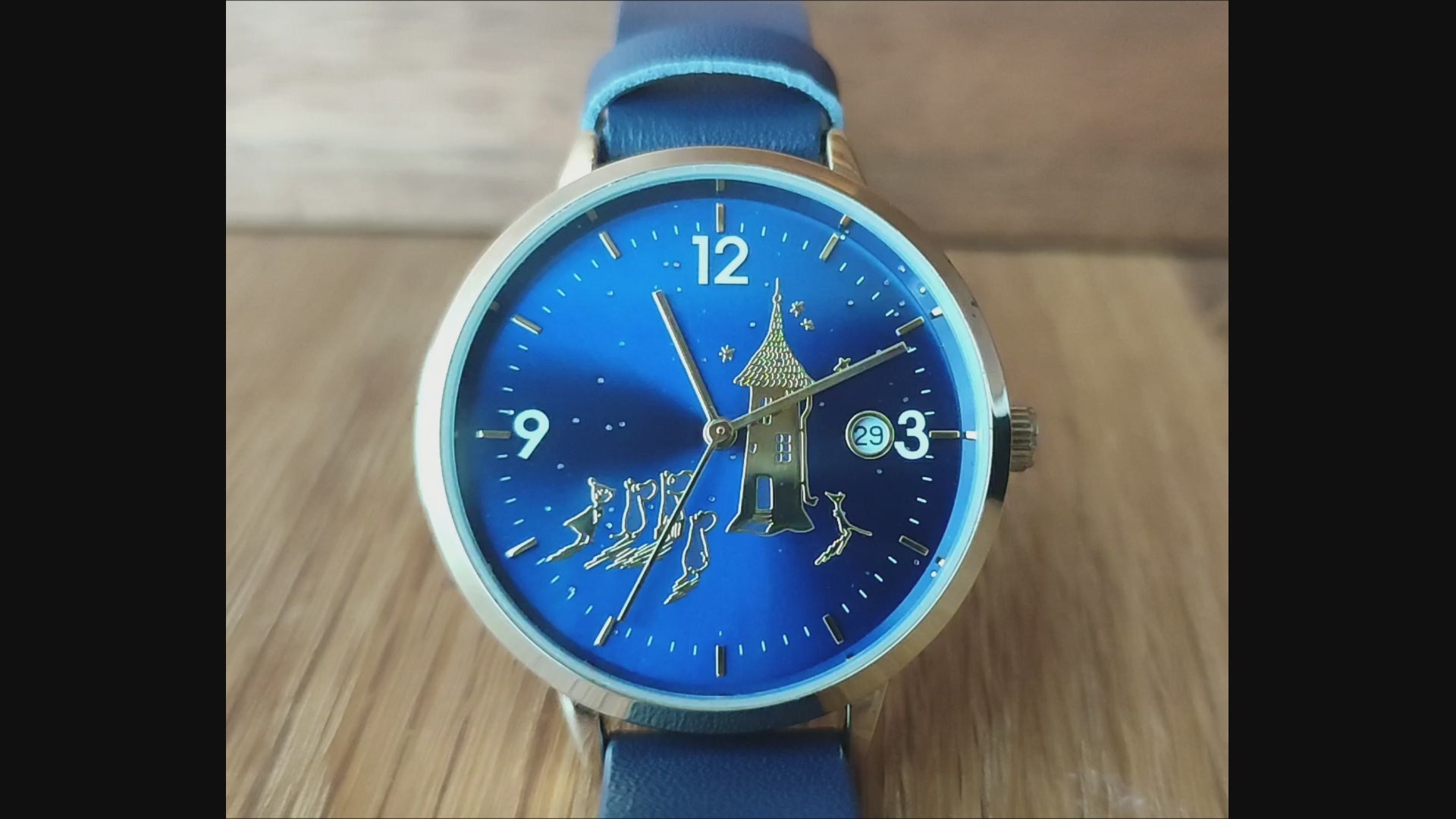 Official Moomins Japanese wrist watch with Moomintroll, Little My, Sniff and Moomin Light House characters.